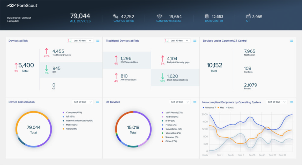 ForeScout cho phép giám sát sự xuất hiện của các Assets mới ngay tại thời điểm chúng được kết nối vào hệ thống mạng bằng các công nghệ chủ động hoặc bị động (active/ passive) để quản trị toàn bộ hệ thống liên tục theo thời gian thực.