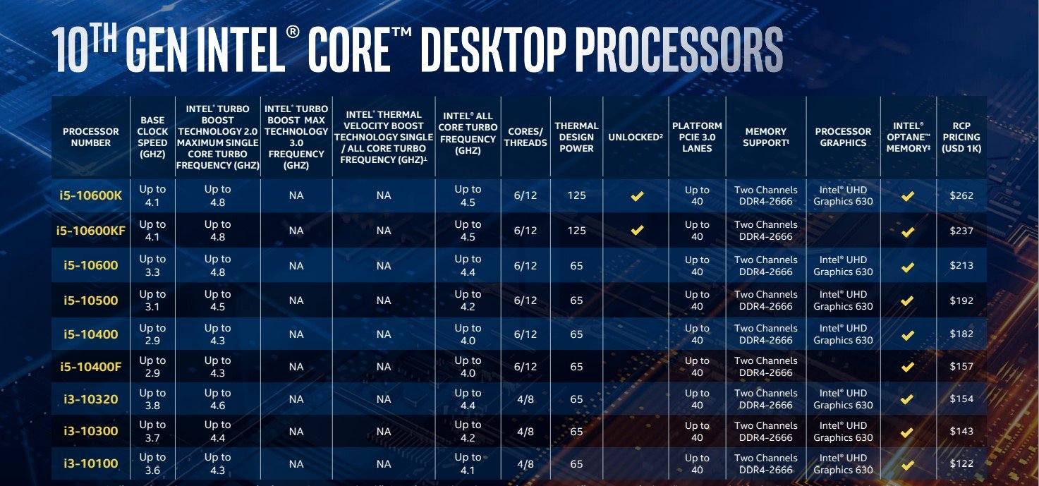 Và như vậy là Intel cũng đã kịp ra mắt những vi xử lý thế hệ 10 (Comet Lake-S) dành cho desktop. Không khác so với những thông tin rò rỉ trước đó, Intel đã mở siêu phân luồng cho tất cả các phiên bản Core i từ i3 đến i9 cùng với giá bán khá hấp dẫn để có thể cạnh tranh tốt hơn với đối thủ AMD.