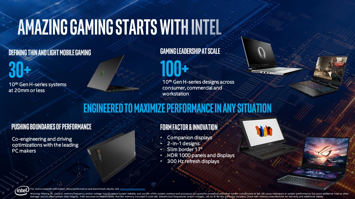 Intel cho biết tính đến thời điểm công bố thì dòng Comet Lake-H đã có trên 30 mẫu laptop chơi game mỏng nhẹ và hơn 100 mẫu laptop hiệu năng cao trong nhiều phân khúc từ gaming đến commercial, workstation. Ngoài ra, Intel cũng thực hiện chương trình hợp tác với các OEM làm laptop để tham gia thiết kế và tối ưu hiệu năng cho mỗi mẫu máy cũng như thúc đẩy phát triển các form máy mới lạ hơn, tạo ra tiện ích cho người dùng.