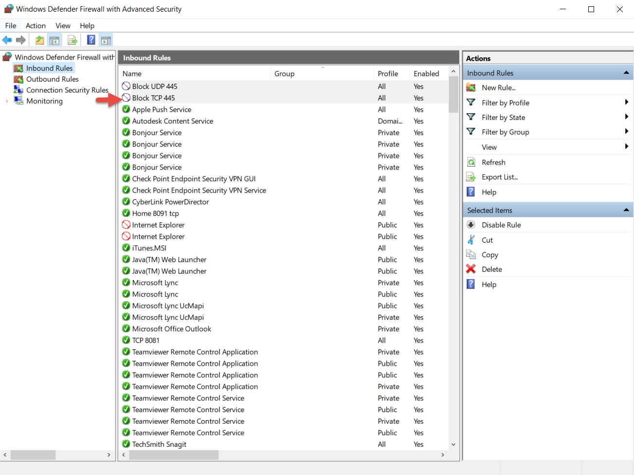 - Block Port TCP 445: